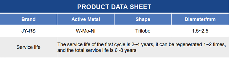 JY-RS catalyst is a protective catalyst for hydrodesilication developed to meet the needs of hydrorefining of coking naphtha. It has the characteristics of high activity and strong silicon capacity. The results of industrial application show that the catalyst can reduce the inlet temperature of the reactor, reduce the spontaneous coking of raw oil, reduce the carbon accumulation of the catalyst, and effectively prolong the operation period of the unit.